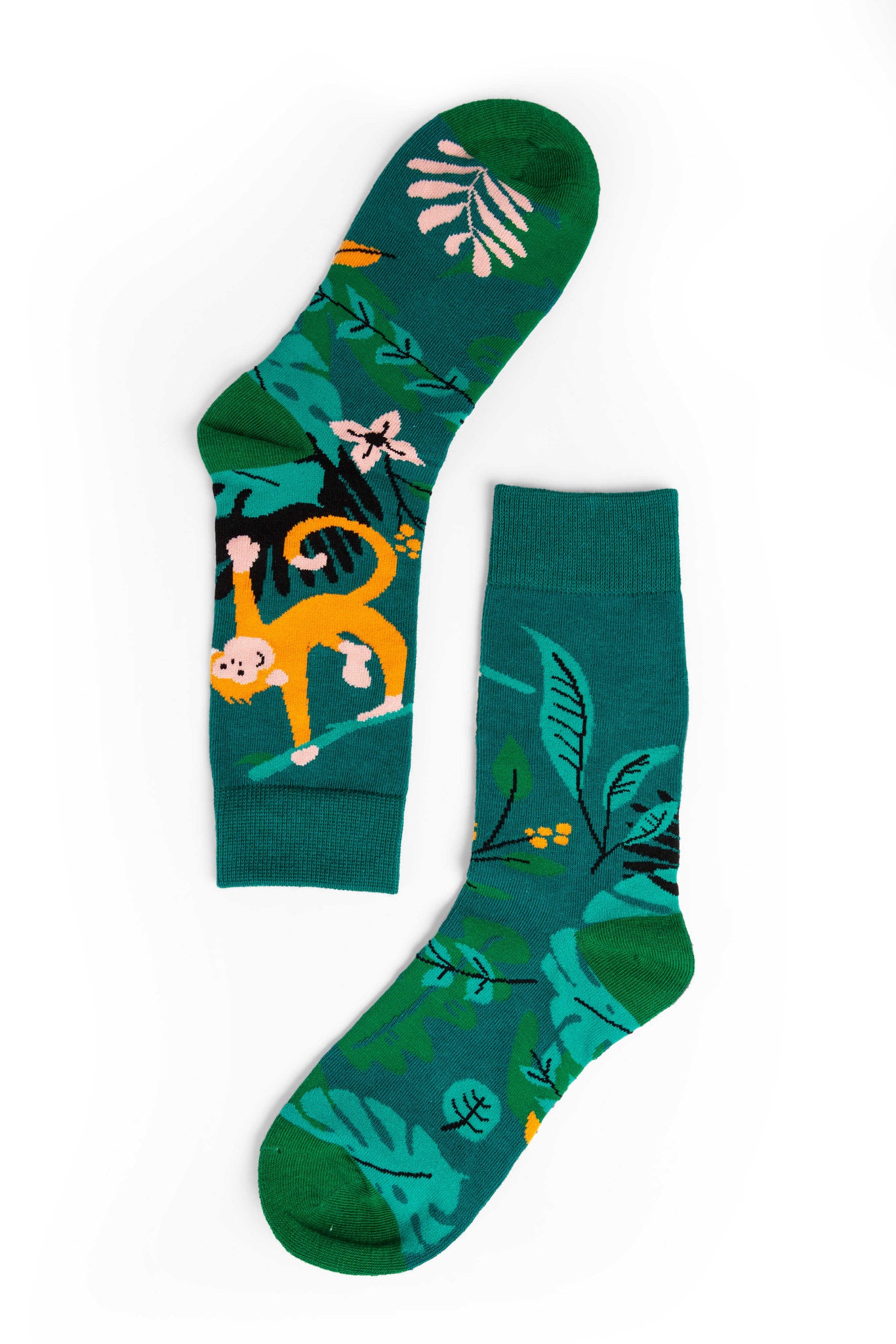 Hang je graag de aap uit? Dan zijn deze coole sokken met junglemotief iets voor jou! De sokken matchen perfect met de muco socks voor volwassenen met als verschil dat bij de kindervariant onze mascotte tussen het gebladerte slingert.
